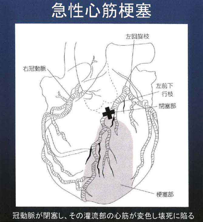心筋梗塞症は心臓の筋肉(心筋)を栄養している冠動脈の血流が途絶し、心筋に酸素が全く行き渡らなくなる(絶対虚血)病気です。心筋は壊死(えし)を生じ、虚血を起こした部分が動かなくなります。心筋梗塞症は発症からの時間によって、72時間以内のものを急性心筋梗塞、3日~1ヶ月のものを亜急性心筋梗塞、1ヶ月以上経過したものを陳旧性心筋梗塞と大まかに分類しています。